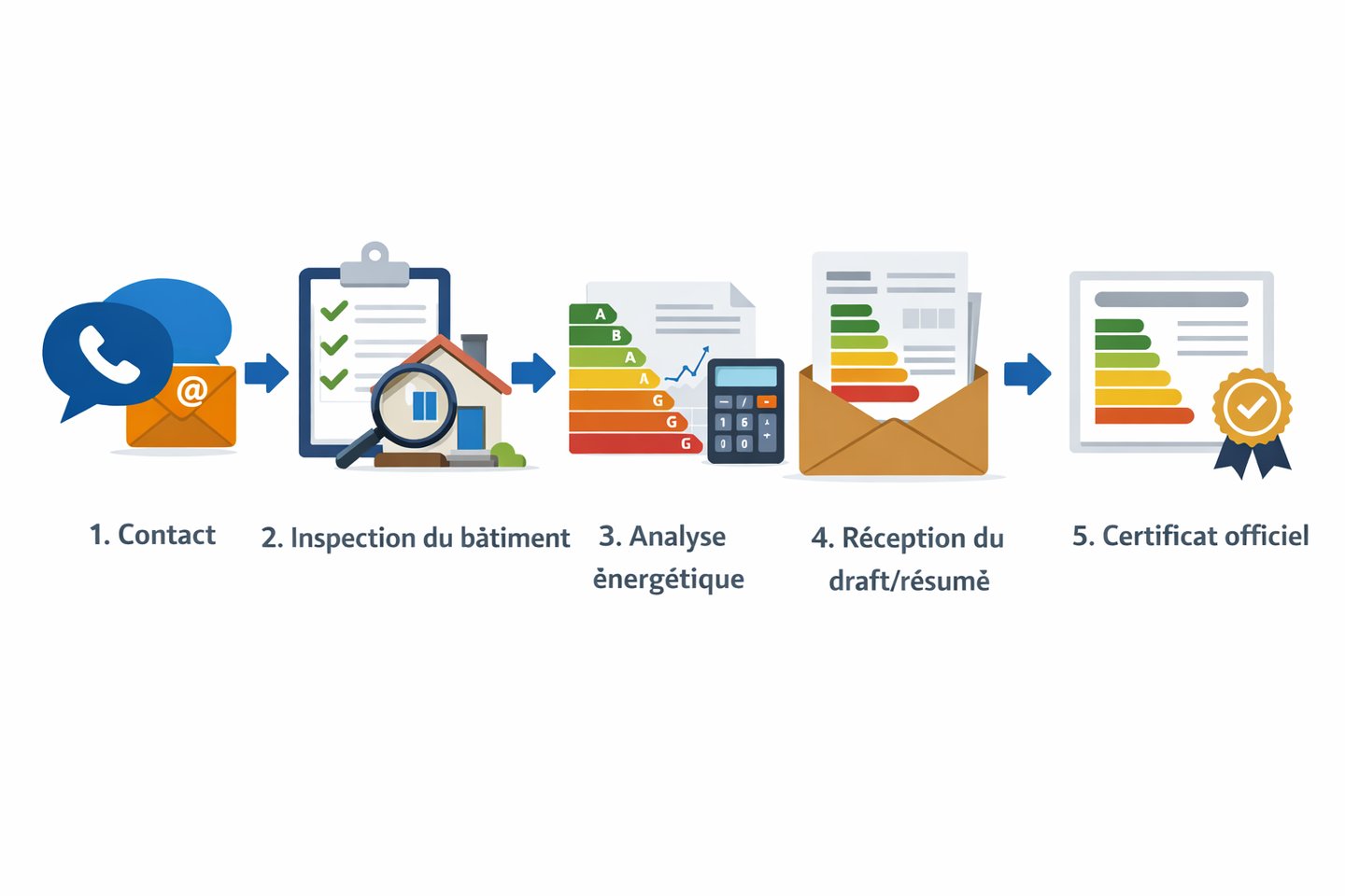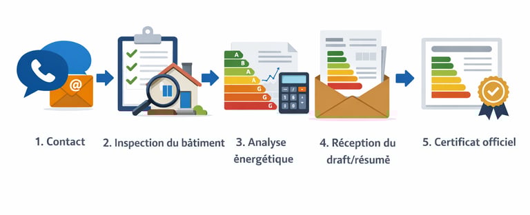 Vous prenez contact avec un expert PEB agréé afin de fixer un rendez‑vous pour la visite du bien.